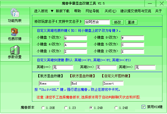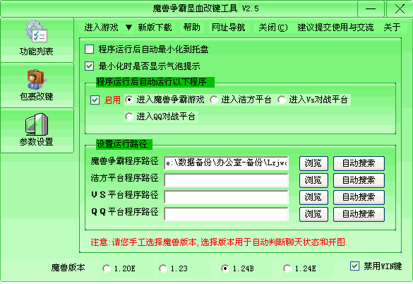 主要功能:魔兽显血、自定义包裹热键和英雄热键、快速自动进入魔兽游戏、浩方平台、VS平台和QQ平台等。